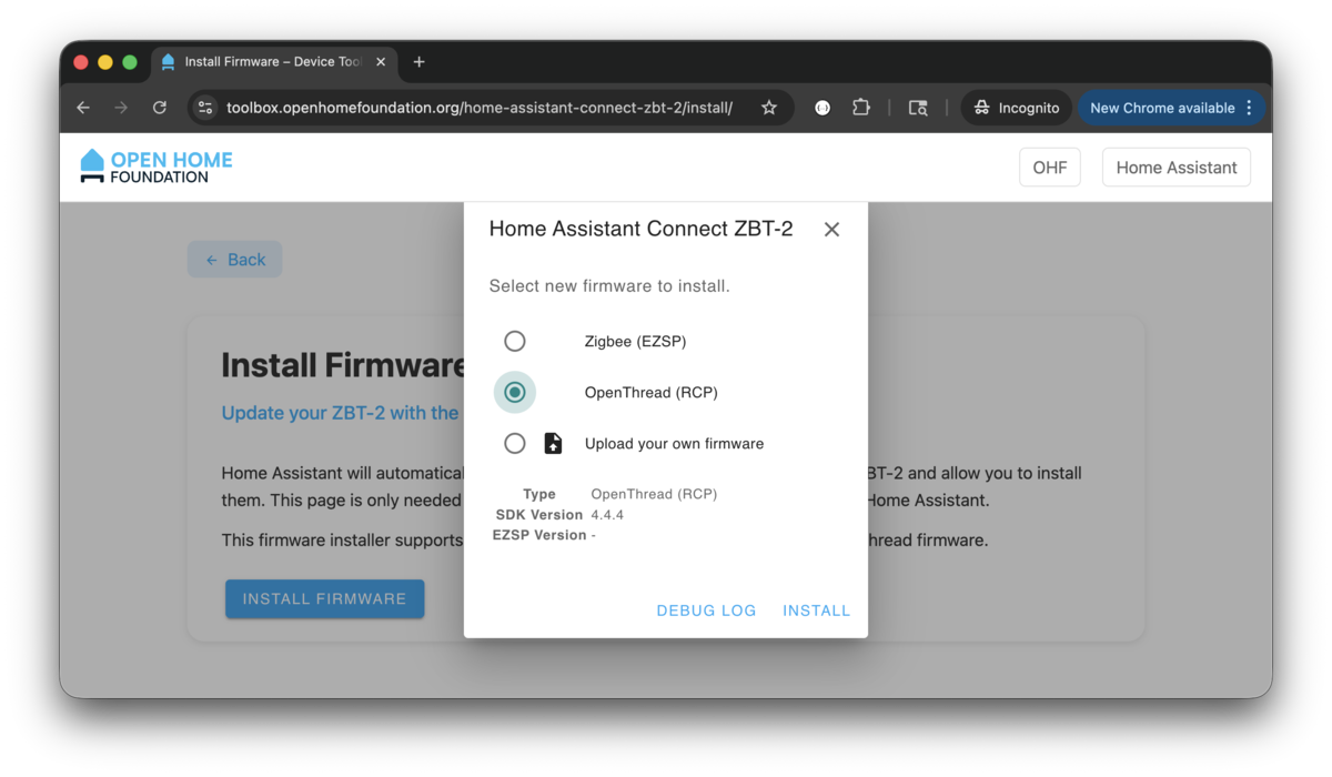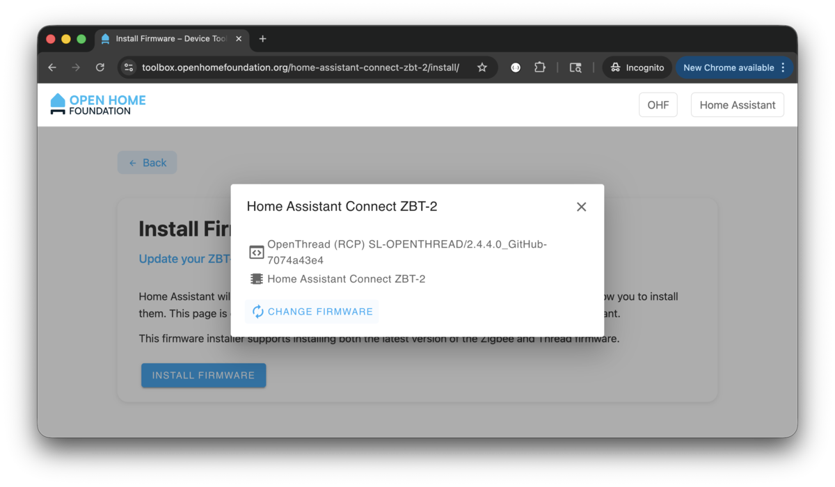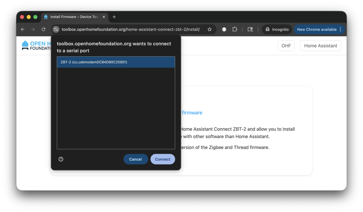- Go to https://toolbox.openhomefoundation.org/home-assistant-connect-zbt-2/install/ with Chrome.