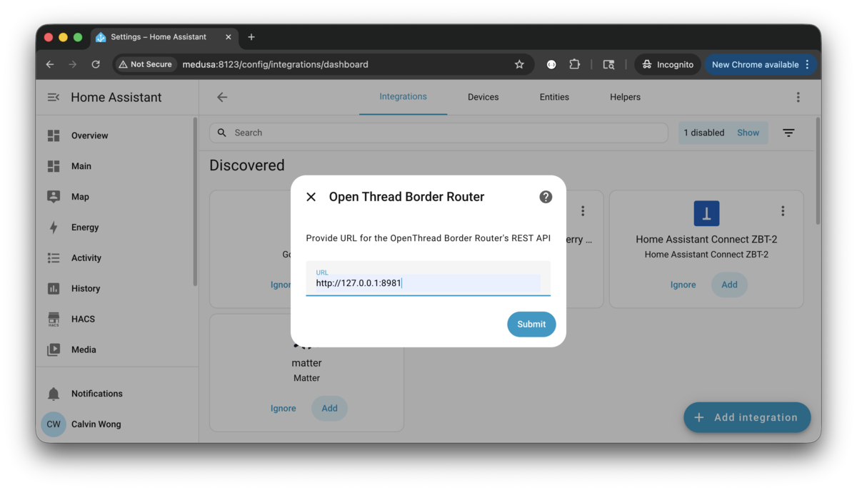 - Open Thread Border Router: This will prompt you to enter the URL for REST API (http://127.0.0.1:8981).