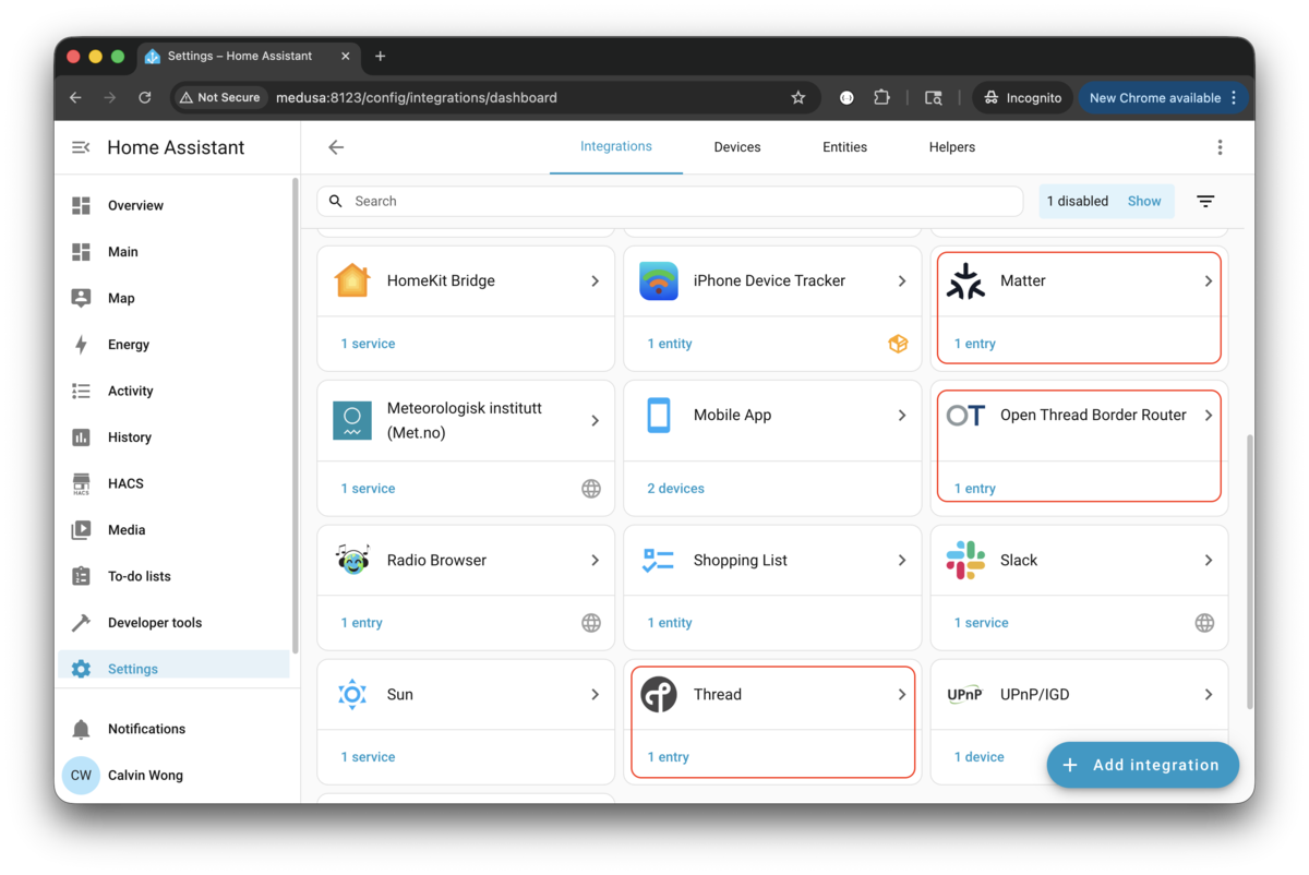 Log into your Home Assistant admin portal and add the following Matter/Thread integrations.