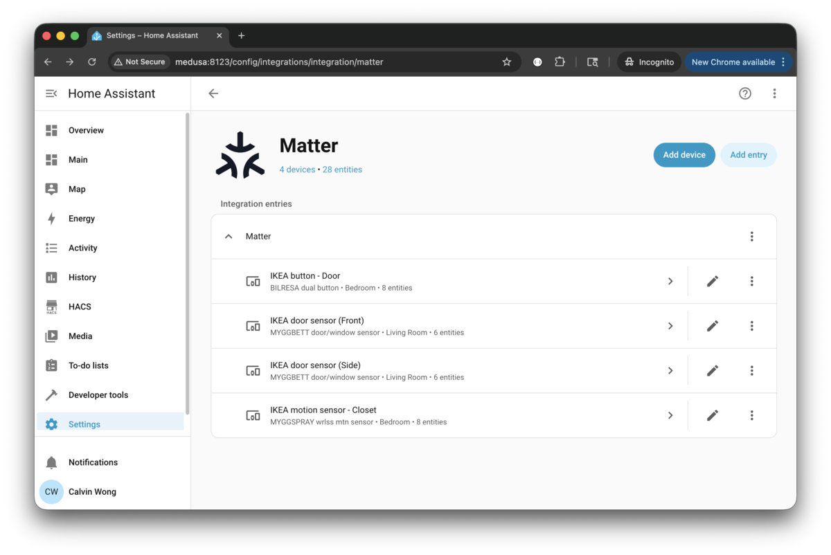 Once the devices have been added, you can confirm under Matter in Integration.