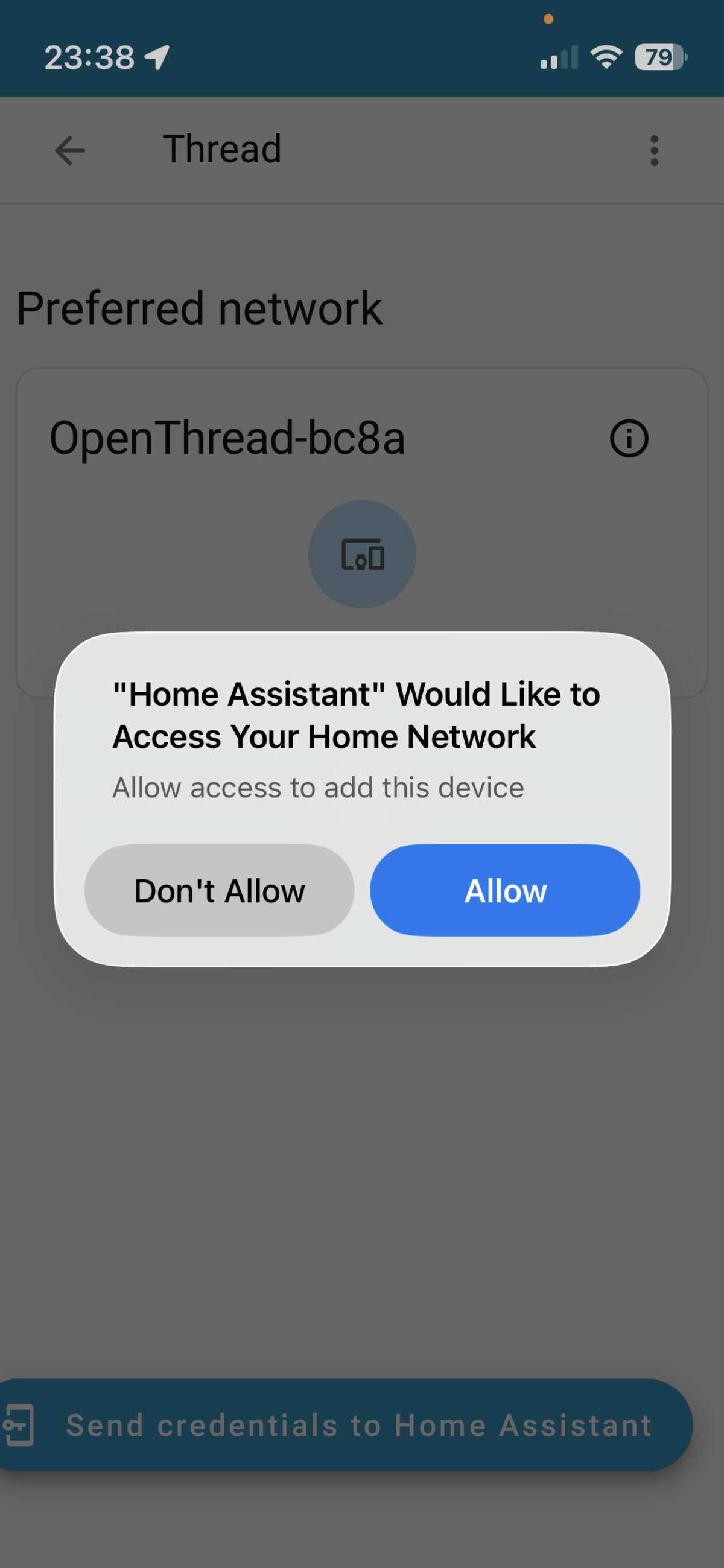 Threadintegration in the phone app, clickSend credentials to Home Assistant. - We can now add Matter devices.